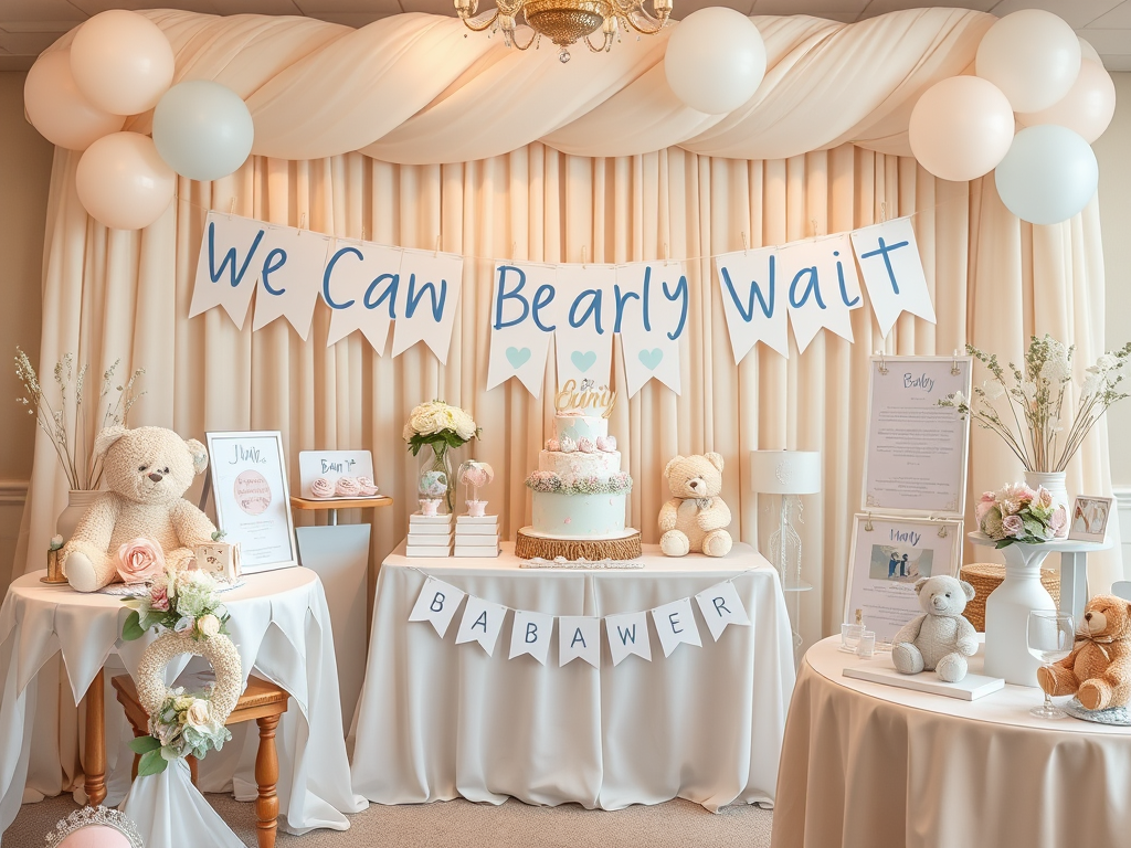 - Balloon Arch & Backdrop: A balloon arch in soft colors with a backdrop that says “We Can Bearly Wait!” is perfect for photos.