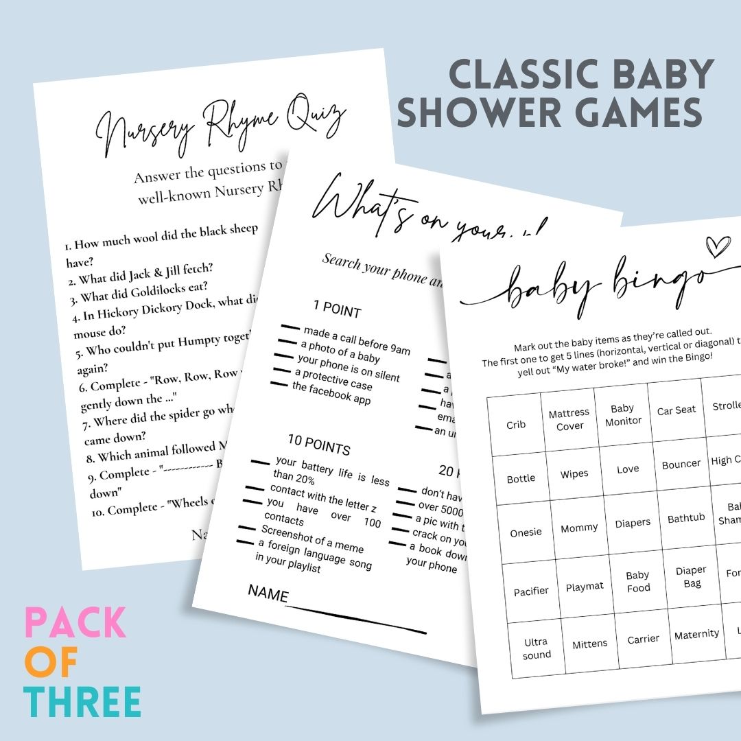 3 Classic Baby Shower Games Combo, Baby Bingo, Nursery Rhyme Quiz and What’s on Your Phone Game, 25 Cards Each